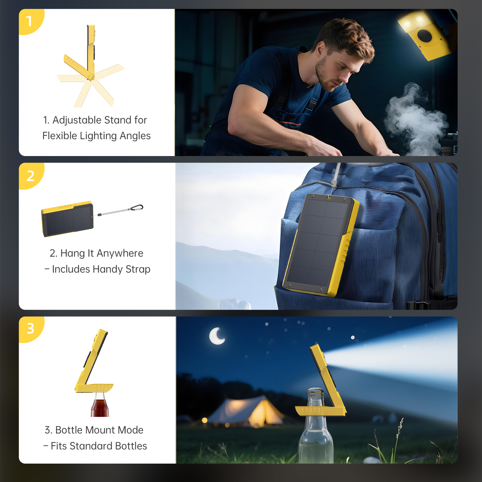 Widely applications: It’s used for a wide range of purposes, such as camping, barbecue, eating, reading, fishing, help, car repair, parties, including natural disasters caused by power outage situations need to use it.